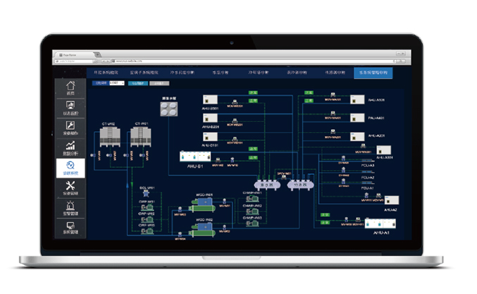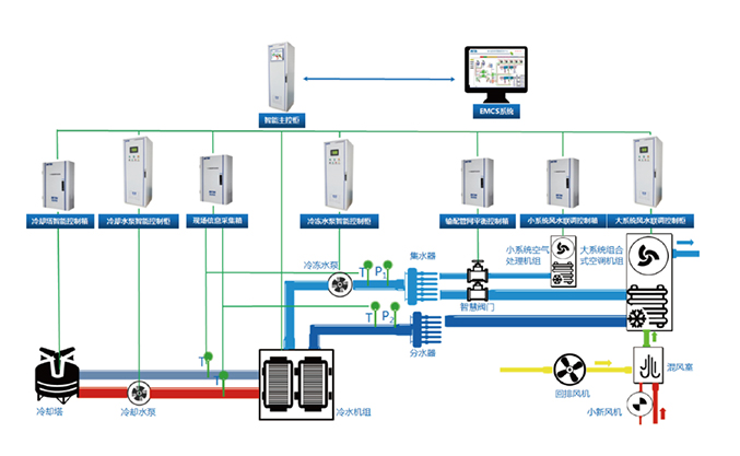 系統由智慧冷凍站、智慧輸配系統和智慧控制系統構成,主要從末端用戶負荷需求著手,解決輸配系統水力失調問題,提高中央空調系統運行效率,降低設備運行能耗,實現系統COP最優。